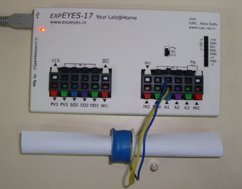 On fait tomber un aimant à travers une bobine et le signal de tension qui en résulte est représenté en fonction du temps. Le montage expérimental est présenté ci-dessous, ainsi que le signal capturé.