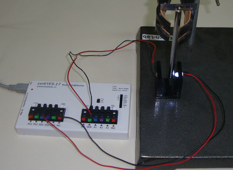 On fait osciller le pendule entre une DEL et un photo-transistor. La période est mesurée en surveillant de signal du photo-transistor. La réolution de la mesure est proche de 100 µs, si bien que de petites variations de la période avec l'amplitude peuvent être étudiées.