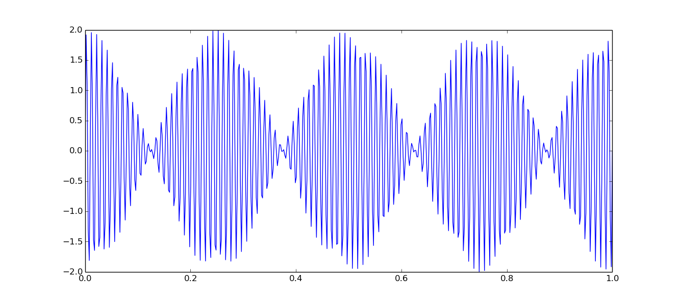 Modulation d'amplitude par multiplication de deux fonction sinus.